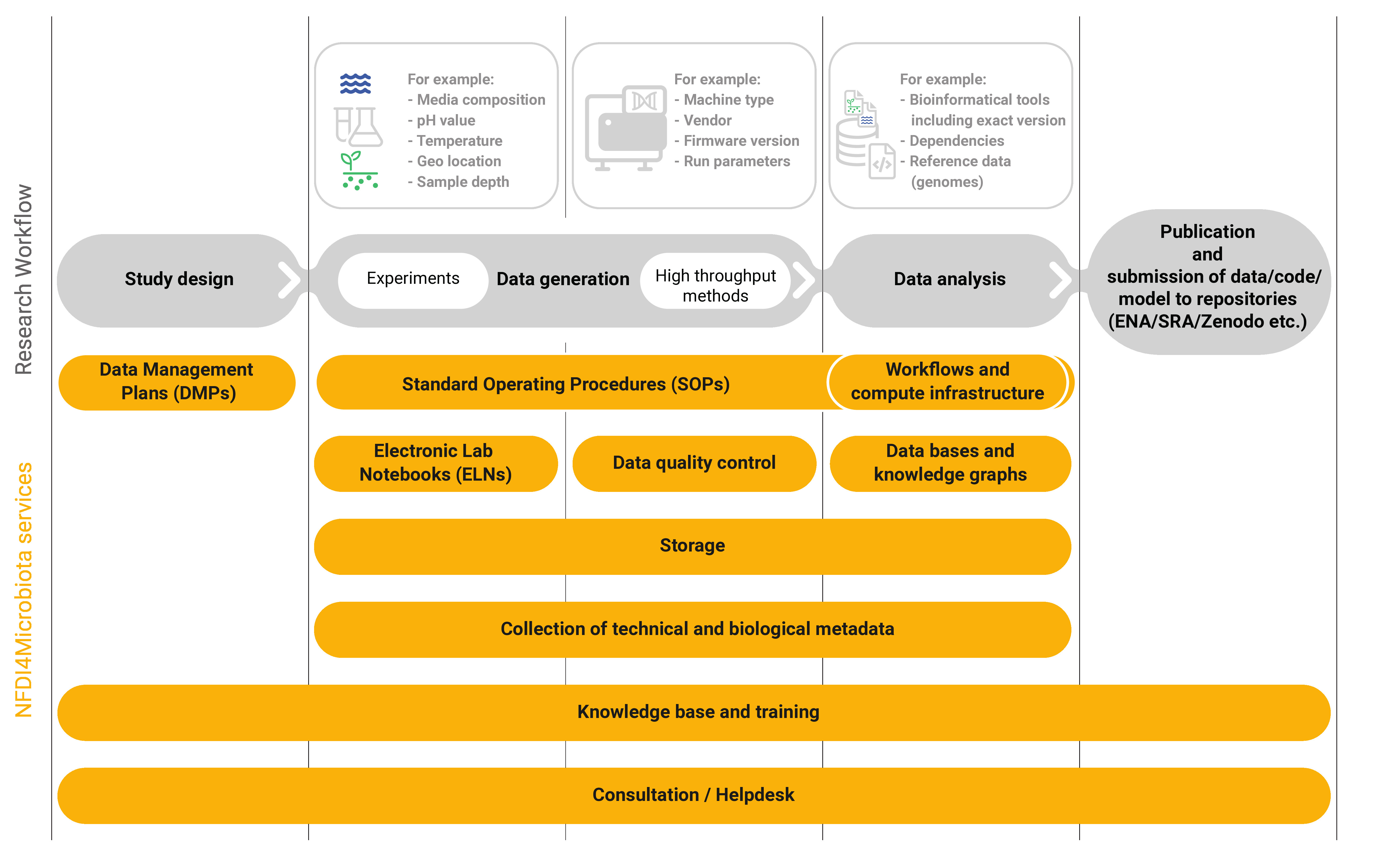 NFDI4Microbiota supports microbiology researchers at every step of their projects from the earliest study design through to data publication by providing best‐practice tools, infrastructure and expert guidance that make microbiology data FAIR (findable, accessible, interoperable, reusable) and reproducible: