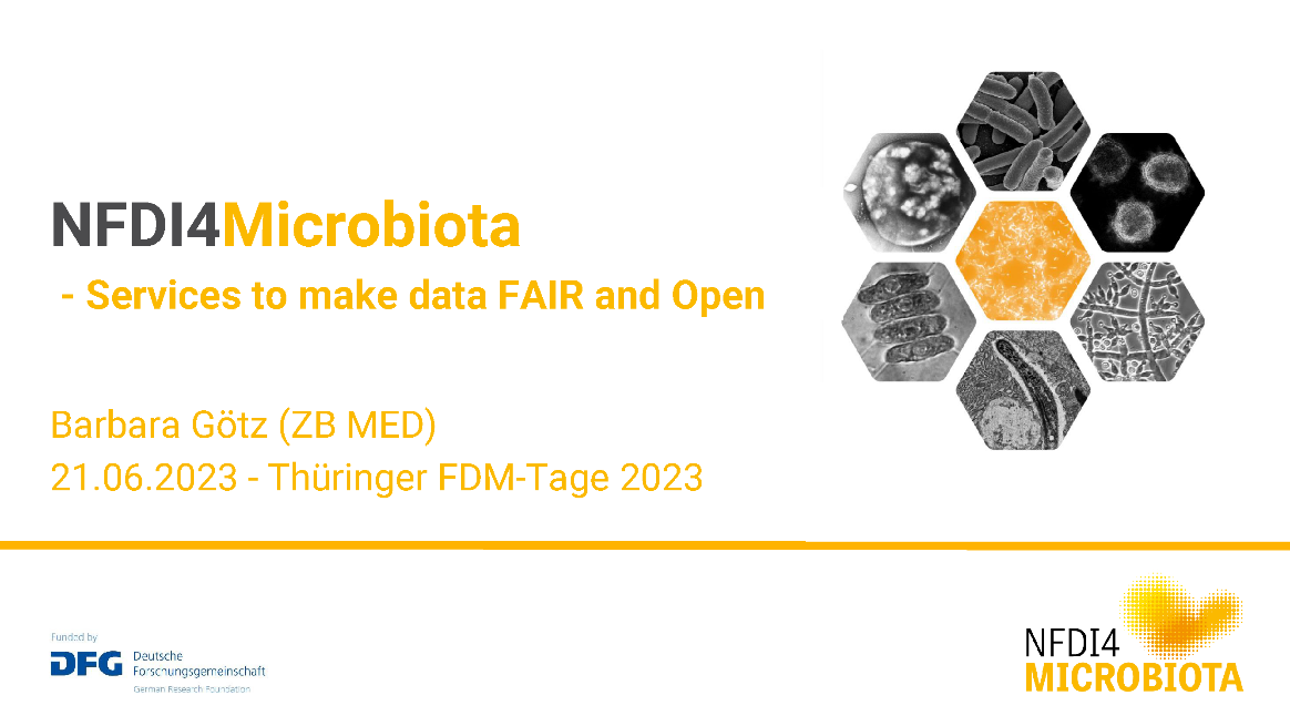The presentation “NFDI4Microbiota - Services to make data FAIR and Open” held by Barbara Goetz, member of NFDI4Microbiota, at the fifth Thuringian RDM Days on 20-21 June 2023 has been recorded and is available online. The slides of the presentation can be found here.